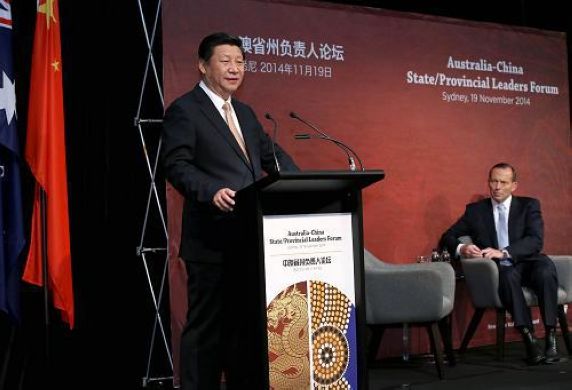 11月19日,国家主席习近平在悉尼与澳大利亚总理阿博特共同出席首届中澳省州负责人论坛。这是习近平在论坛上致辞。