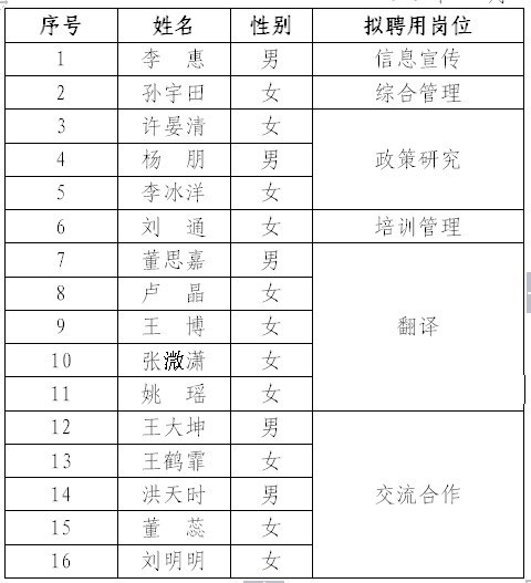 根据《中国人民对外友好协会2013年公开招聘事业单位工作人员公告》的安排,现将我会2013年拟聘用人员名单予以公示。公示期间,如有问题,请向中国人民对外友好协会人事工作部反映。